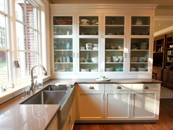 This kitchen was part of a renovation to a 200 year old farm house, with each element of the space taking on its own identity through construction style and finish. While the majority of the cabinetry is done in solid tones, the sink run has a heavily applied glaze over the base color. This project was done in collaboration with architect Jen Spangler Williamson.